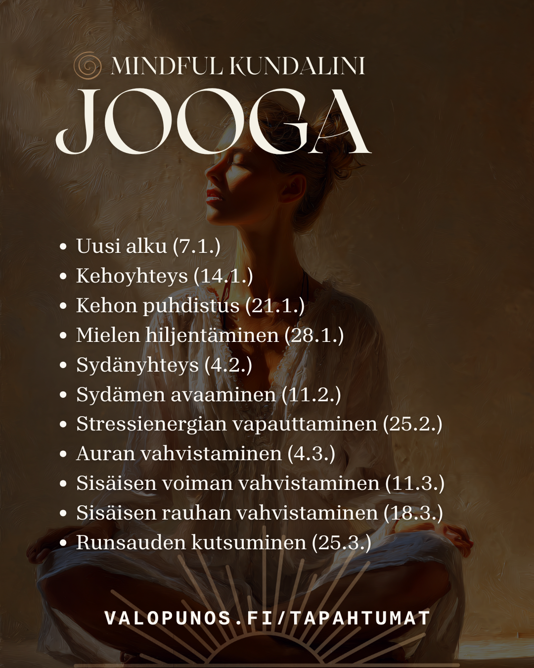 Näissä joogaharjoituksissa pääset kokemaan tietoisen hyväksyvän läsnäolon lempeyden ja sen, kuinka vaikuttava työkalu kundaliinijooga on yhdistettynä mindfulnessiin. Ohjaan sinua siirtymään mielen hälinästä sydämen hiljaisuuteen, avautumaan sallivasti itsellesi ja elämälle. Jooga tarjoaa sinulle mahdollisuuden vapauttaa raskasta, pysähtynyttä energiaa ja vahvistaa kehon, mielen ja sielun yhteyttä.