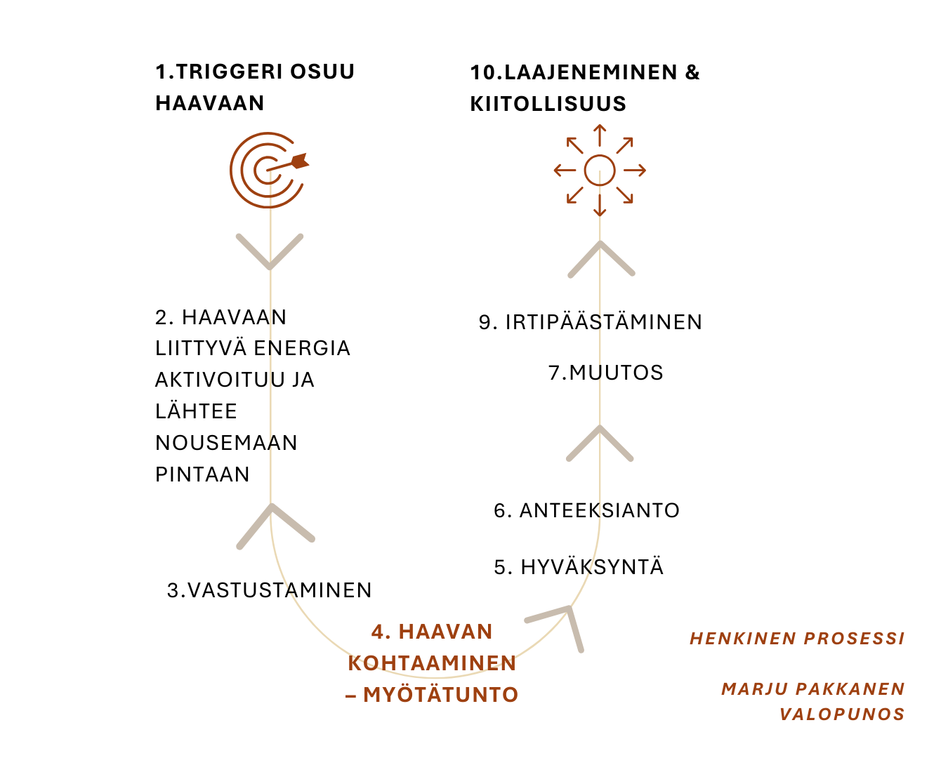 Kuvaan alla henkisen prosessin kymmentä vaihetta yksinkertaistaen. Käynnissä voi olla samanaikaisesti useita erilaisia henkisiä prosesseja eri vaiheissa tai yksi prosessi voi seilata eri vaiheiden välillä. Myös prosessien kestoilla on eroja siinä missä jonkun voi käydä läpi lyhyessä ajassa ja toinen voi viedä useita kuukausia, tai vuosia. Jokainen prosessi ja vaihe on joka tapauksessa yhtä arvokas ja oikein.