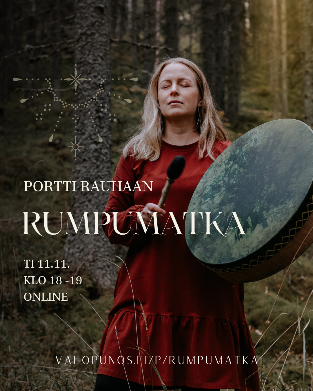 "Tein tämän rumpumatkan tänä aamuna tämän tallenteen kautta. Haluan ensimmäisenä sanoa kiitos, kiitos ja vielä kerran kiitos!! Tämä matka oli minulle todella merkittävä! Sain tämän matkan kautta purettua kehostani todella isoa, raskasta lastia, jota olen kantanut pitkään, vuosikymmeniä. Kun lähdin lammelta kävelemään takaisin päin, huomasin kuinka kyyneleet vaan valuivat poskiani pitkin. Oloni oli todella kevyt ja helpottunut. En yhtään osannut odottaa, mitä tämä matka tuo minulle tai edes sitä, mikä asia nousee käsittelyyn. Kuvittelin että käsittelyyn nousee asioita, jotka ovat juuri tällä hetkellä pinnalla, mutta tämä matka nostikin jotain aivan muuta. Tajuan, että just nyt oli oikea hetki tälle kaikelle. Olen vasta tänä syksynä törmännyt aivan sattumalta siihen, kuinka voimakkaasti rumpu vaikuttaa minun kehooni, ja siis pelkästään positiivisesti. Se menee syvälle kehoon. Kiitos vielä kerran, että sain tehdä tämän rumpumatkan sinun johtamana. Kaikki toimi erittäin hyvin. "