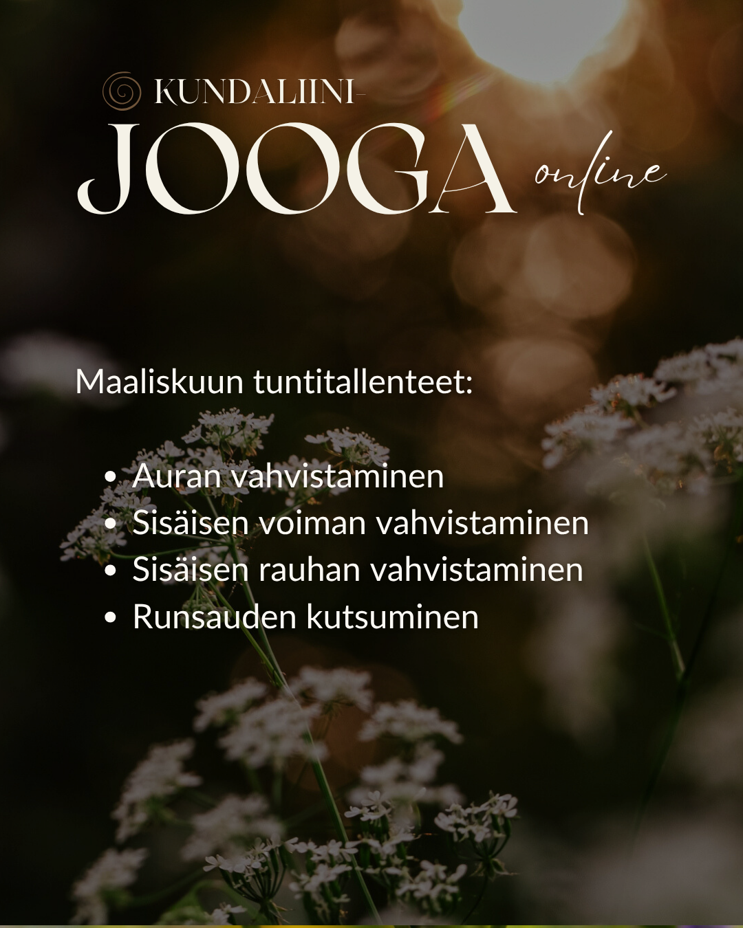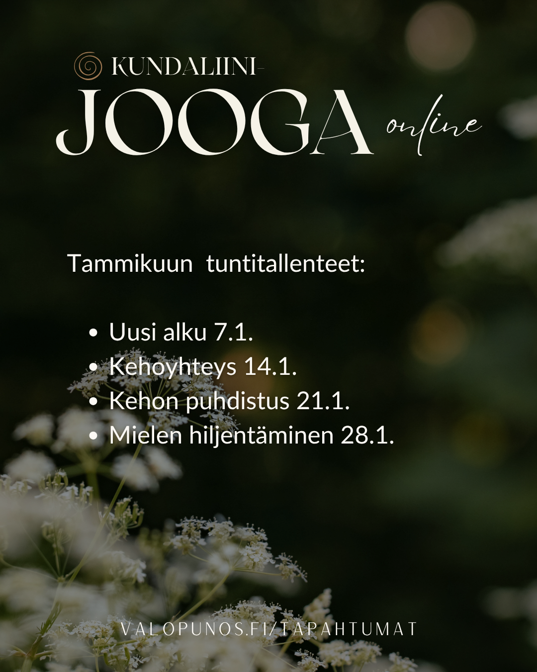 Täältä löydät kaikki Valopunoksen tulevat tapahtumat sekä viikkojoogatuntien tallenteet, joiden avulla voit harjoitella silloin kun sinulle sopii.