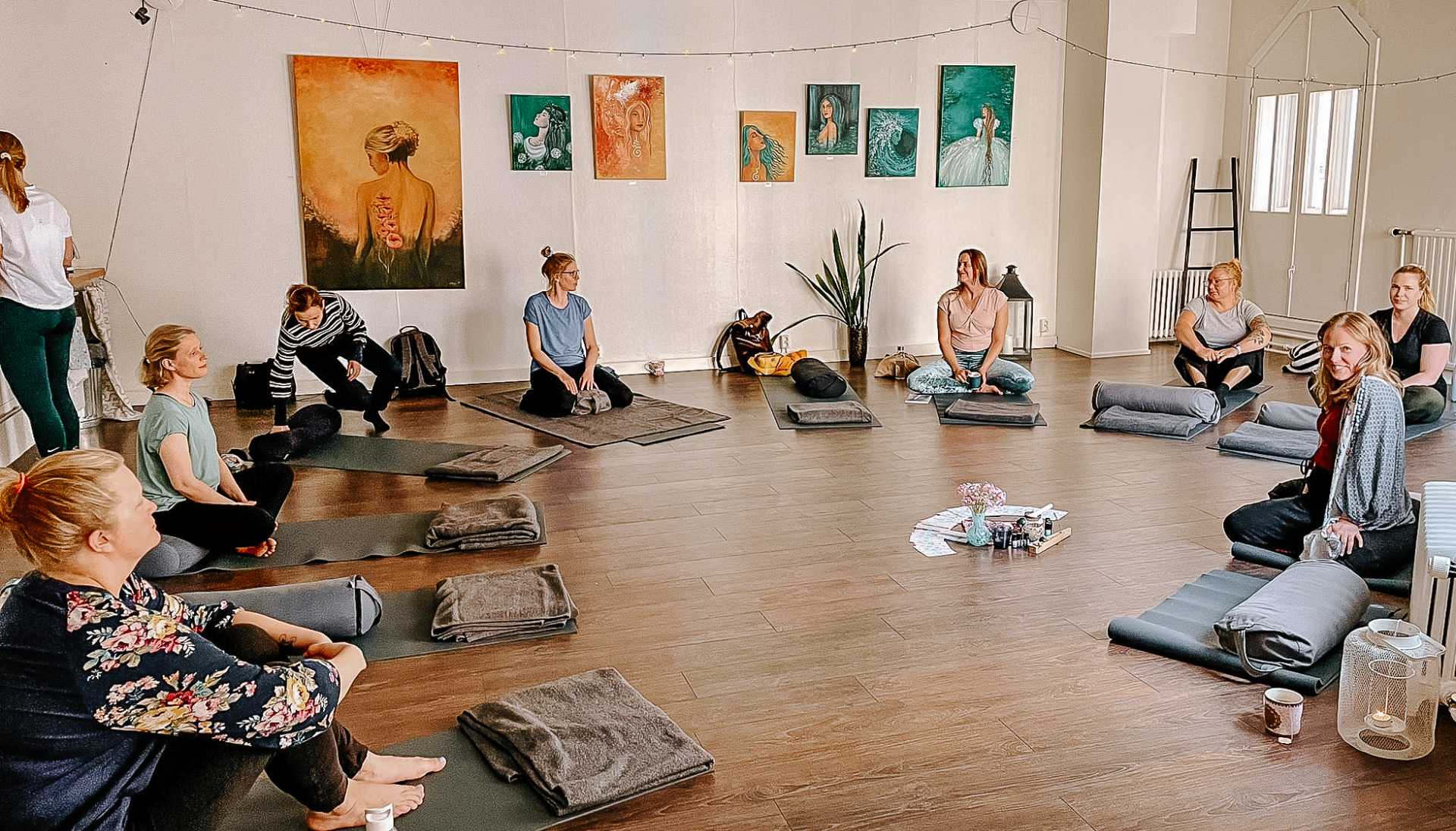 - halutessasi oman joogamaton, mutta tilasta löytyy lainaan joogamattoja, vilttejä ja tyynyjä.